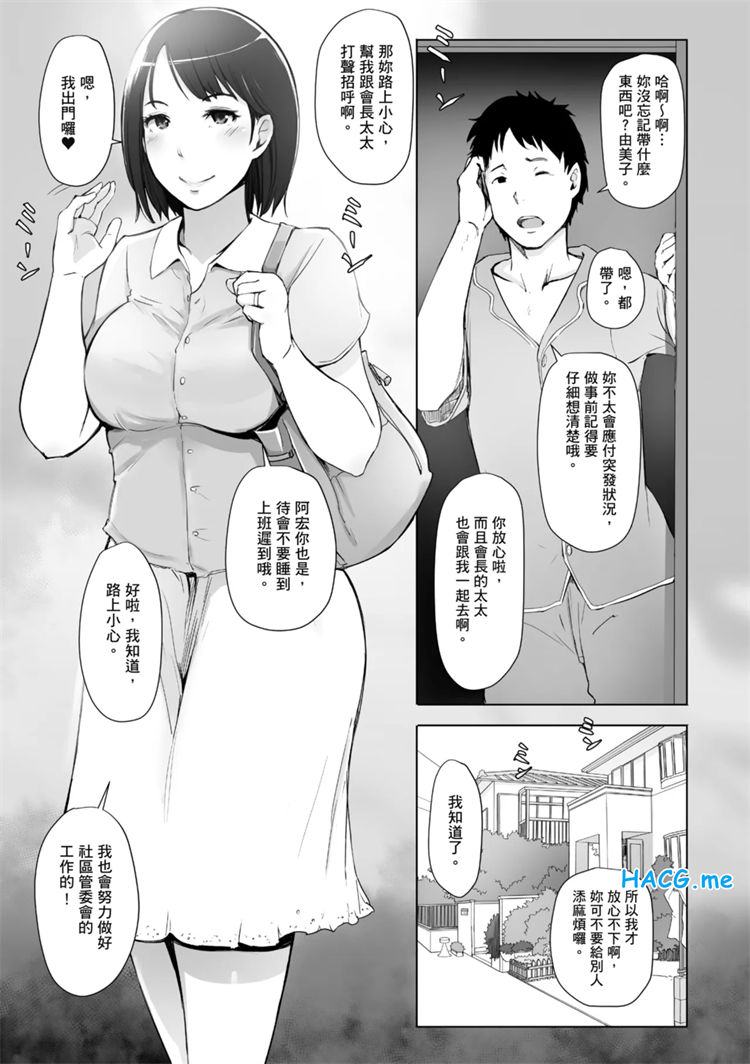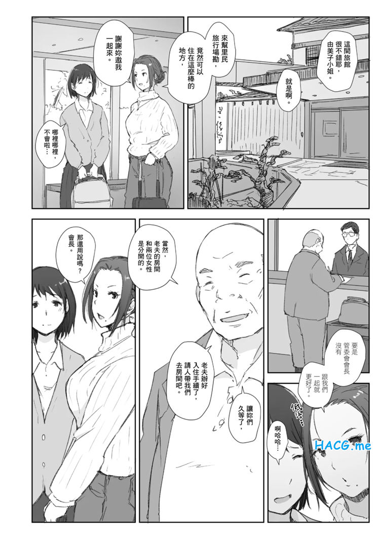 人妻由美子找了曾經是寫真偶像,個性強勢的人妻歩美和她一起去為里民溫泉旅行場勘。步美覺得同行的管委會會長是個腹黑的人,下定決心要保護溫柔又沒主見的由美子。她的不祥預感果然成真——晚餐席上,管委會會長忽然介紹了一位據說是議員、眼神明顯色眯眯的中年男人……